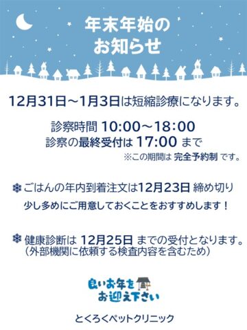 当院の年末年始に関するお知らせ お知らせ 2025.12.05 早いもので2025年も残すところ一か月を切っています。 慌ただしい年末年始、皆さまごはんやお薬のご用意はお済みですか? 年末年始に関するお知らせになります。 よろしくお願いいたします☆